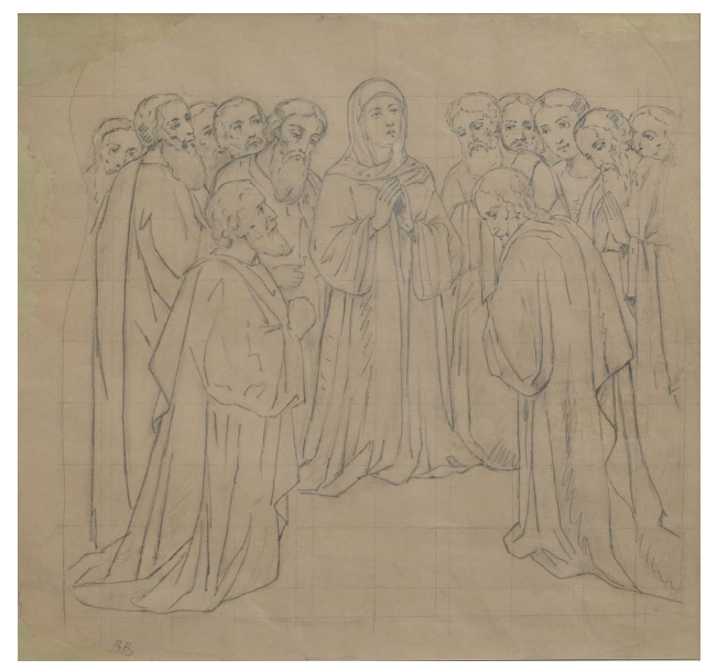 На экспозиции «Евангельские мотивы в эскизах церковных фресок великих русских художников XIX–XX веков», поддержку которой оказывает компания ДСЛ-Сервис, представлен карандашный рисунок на картоне Виктора Васнецова «Сошествие Святого Духа на апостолов», выполненный как эскиз для росписи Софии Киевской или Крестовоздвиженской церкви Киево-Печерской Лавры.